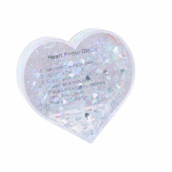 Foto snježna kugla ukras 97 x 91 mm – srcolik oblik sa srebrnim šljokicama i srcima