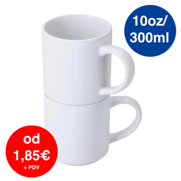 Ova naslagiva sublimacijska šalica jedinstvena je jer se može slagati jedna na drugu – prva takva u svijetu sublimacijskih šalica. Izrađena je od sjajne bijele keramike i presvučena prozirnim polimernim premazom, pa je idealna za sublimaciju. Ispišite je logotipom svoje tvrtke ili je personalizirajte fotografijom ili imenom kupca.