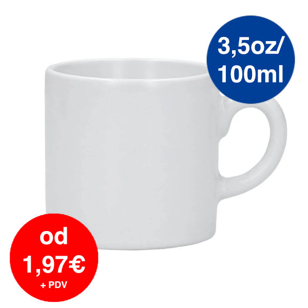 Ova sublimacijska šalica od 3.5oz / 100 ml izrađena je od bijele keramike i ima prozirni polimerni premaz, što je čini idealnom za personalizaciju putem sublimacije. Savršeno pristaje uz espresso aparat.