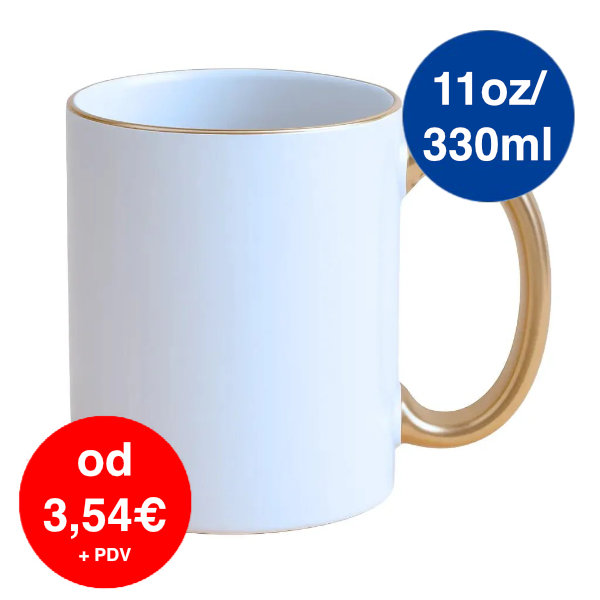 Sublimacijska šalica 11oz / 330 ml izrađena od bijele keramike s pozlaćenim rubom i drškom spremna je za sublimaciju. Površina je zaštićena prozirnim polimernim premazom koji omogućuje personalizaciju fotografijom, slikom ili tekstom.