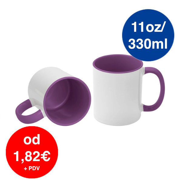 Keramička šalica kapaciteta 11oz / 330 ml s ljubičastom unutrašnjošću i ručkom spremna je za sublimaciju. Zahvaljujući prozirnom polimernom premazu možete je personalizirati dodavanjem fotografije, logotipa ili teksta.