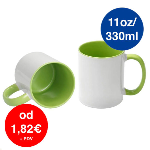 Keramička šalica kapaciteta 11oz / 330 ml sa svijetlozelenom unutrašnjošću i ručkom spremna je za sublimaciju. Zahvaljujući prozirnom polimernom premazu može se personalizirati dodavanjem fotografije, logotipa ili teksta.