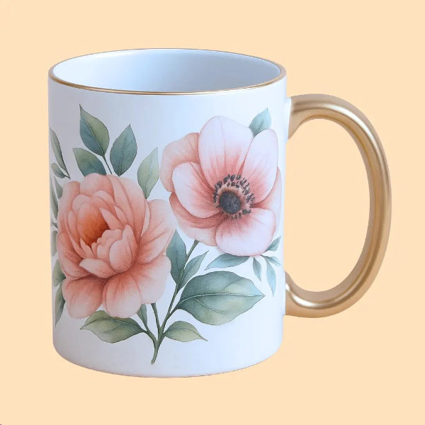 Sublimacijska šalica 11oz / 330 ml izrađena od bijele keramike s pozlaćenim rubom i drškom spremna je za sublimaciju. Površina je zaštićena prozirnim polimernim premazom koji omogućuje personalizaciju fotografijom, slikom ili tekstom.