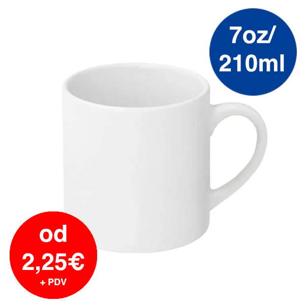 Ova mala bijela keramička šalica od 7oz / 210 ml idealna je za sublimaciju i savršeno odgovara za cappuccino. Zahvaljujući prozirnom polimernom premazu, lako se personalizira za vaše kupce pomoću sublimacijskog tiska.